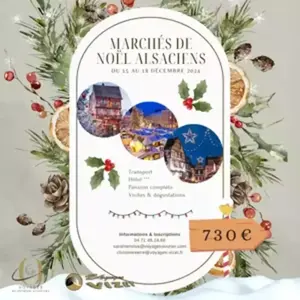 Jour 1 - Kaysersberg Départ et route vers l’Alsace. Arrivée en début d’après-midi à Kaysersberg. Temps libre à la découverte de la ville médiévale et de son marché de Noël. Une parenthèse enchantée et fantastique. Découvrez des produits artisanaux, rencontrez des créateurs talentueux dans leurs petits chalets en bois blottis au coeur du centre historique de la cité médiévale. Départ pour l’hôtel, dîner et nuit. Jour 2 - Colmar Petit déjeuner à l’hôtel et route vers Colmar. Rendez-vous à l’office de tourisme avec votre guide et départ à la découverte de la ville à travers une visite guidée pédestre sur le thème “L’âme de Noël”. Au détour des ruelles piétonnes, laissez-vous conter la passionnante histoire de Colmar, ses quartiers pittoresques aux traditionnelles maisons à colombages, ses somptueuses demeures et ses monuments remarquables, le tout dans un décor féérique hivernal. Cette balade sera agrémentée de traditions de Noël en Alsace. Déjeuner traditionnel au restaurant. Temps libre à la découverte des 6 marchés de Noël de la ville. Laissez-vous séduire par l’atmosphère intime et chaleureuse de cette ville d’art et d’histoire.. Servant d’écrin à la fête, la succession des décors et des lumières vous entraîne au fil des rues piétonnes du Vieux Colmar, à la découverte de ses 6 marchés de Noël. Des places illuminées de manière intime et conviviale abritent les marchés de Noël traditionnels de Colmar, scintillant d’objets de décoration et d’art de la table, de cadeaux originaux, mêlés aux spécialités culinaires d’où s’échappent des effluves gourmandes mêlant cannelle et autres épices. Poursuite par la place de la Cathédrale et accueil au musée des Vins d’Alsace. Le travail de la vigne, la récolte, la cave, les métiers du vin, la Route des Vins, les appellations et les vins d’Alsace n’auront plus de secrets pour vous ! Votre visite avec audioguide se terminera par une dégustation de 3 cépages alsaciens. Dîner et nuit à l’hôtel. |